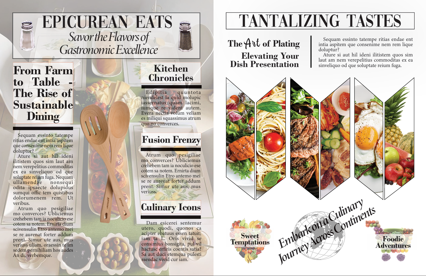This project involved designing a multi-page magazine spread centered around food, culture, and culinary experiences. The goal was to create a visually engaging layout that balances rich imagery with structured editorial content, capturing the essence of gastronomy while maintaining readability and flow.
