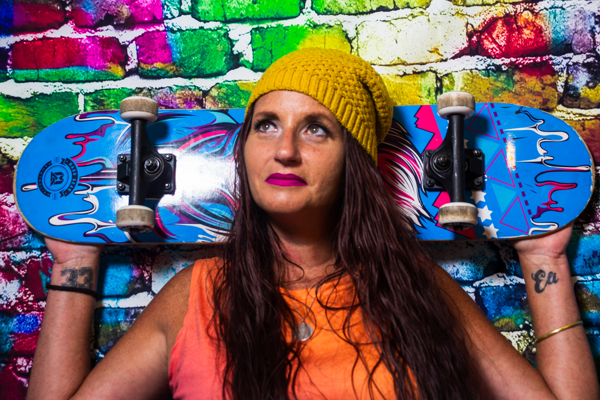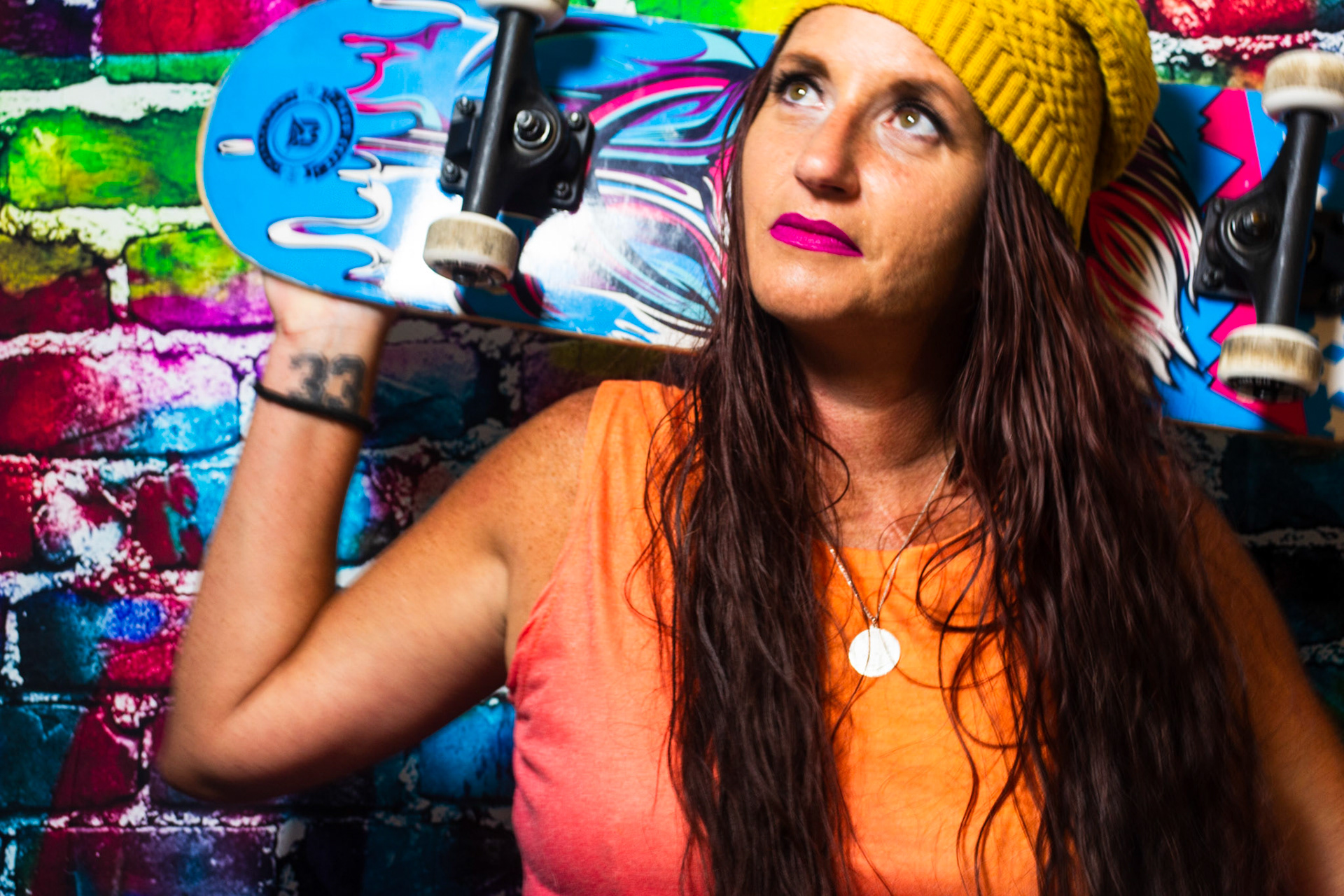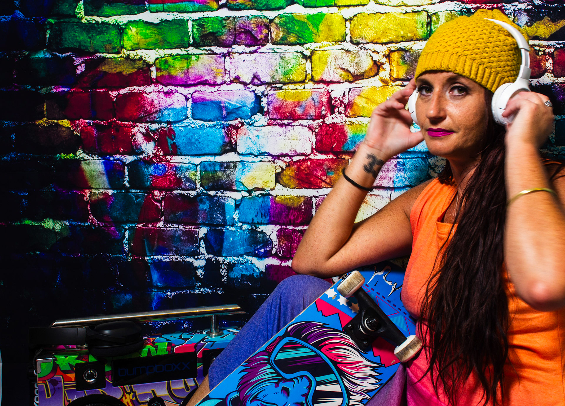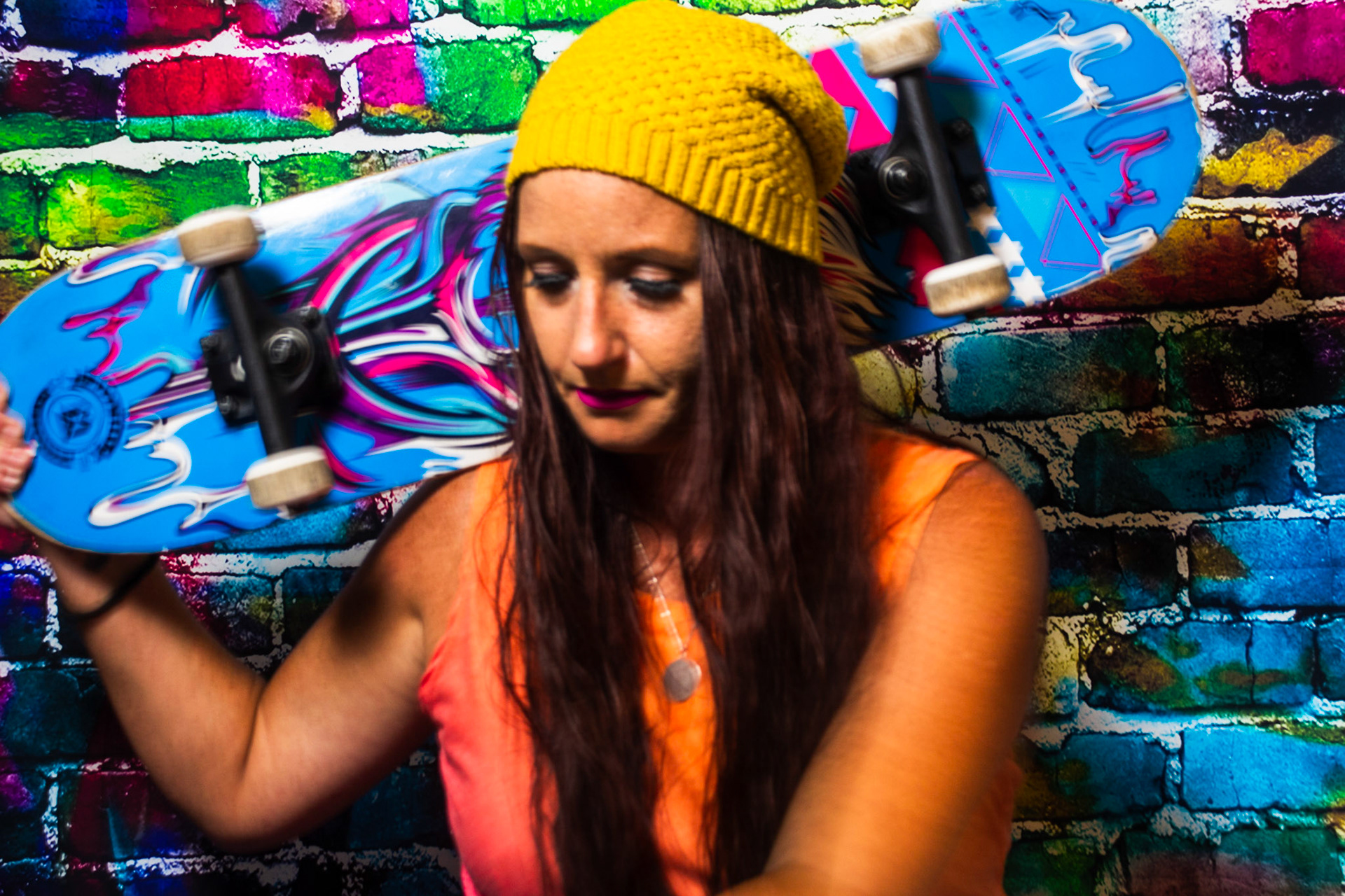 For this mise-en-scène project, I used a colorful graffiti backdrop and styled the scene with props like a skateboard, boom box, and spray paint to create an environment full of energy and self-expression. Since I didn’t have a model, I turned the camera on myself and used a timer to capture these portraits. Some of the images include motion blur — a result of me moving around when the shutter clicked — but I chose to include those moments intentionally. They reflect something real about me: I’m always in motion, constantly creating, and rarely sitting still. This series is a playful, imperfect, and honest snapshot of my personality and the things that inspire me.